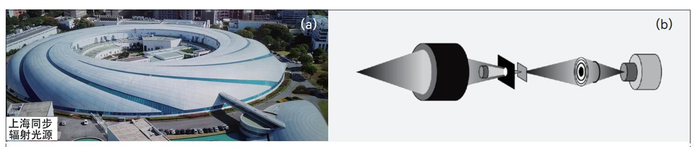 图7 上海同步辐射光源大科学装置及其光学显微系统。(a)上海同步辐射光源鸟瞰图;(b)X 射线线站上建设的X射线显微成像光学系统概念图,其中的波带片透镜是X射线纳米探针的关键核心部件